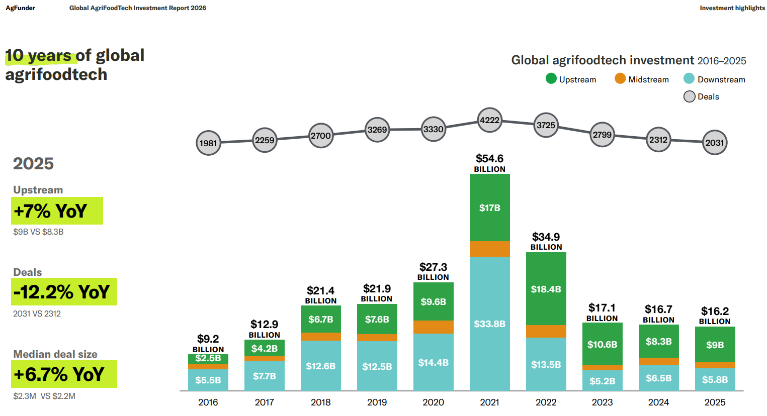 It’s here! Yes, folks, last week was World Agri-Tech in San Francisco, and so once again that means that the team at AgFunderNews released their annual report Global AgriFoodTech Investment Report 2026, which goes in-depth (as always!) into the funding highlights and analysis of why things changed in 2025 and are likely to continue changing in 2026. I have had the chance to read the report for the first time this week. I will give it a couple more reads in the next few weeks, and I often like to compare the content and context to prior years to see where there are some lessons to be learned across multiple years that you don’t always get from a single year analysis. The AgFunderNews is one of the key pieces of analysis for AgriFoodTech. It’s the AgriFoodTech version of Mary Meeker’s Internet Report, and it’s absolutely must-see TV (or must-read print!).