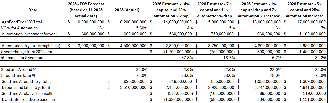 And here we get to the fun with spreadsheets portion of the article, and who doesn’t like to see some fun with spreadsheets in an AgTech article? I went through a couple of modeling exercises and played them all the way out. In the spreadsheet below, you can see that I took the old 2025 forecast (when all we had was first half of 2025 data) and compared it to actual in the first two columns, then ran the numbers out straight-line as a baseline for a five-year projected total. Then I took four different scenarios that used different amounts of overall AgriFoodTech VC funding and the percentage of that funding that was in the automation category. The four scenarios I used for total AgriFoodTech VC were $14B, $15B, $16B, and $17B. The four scenarios I used for automation were 4%, 5%, 6%, and 7%. You can see the details here.